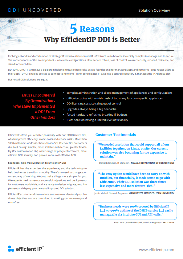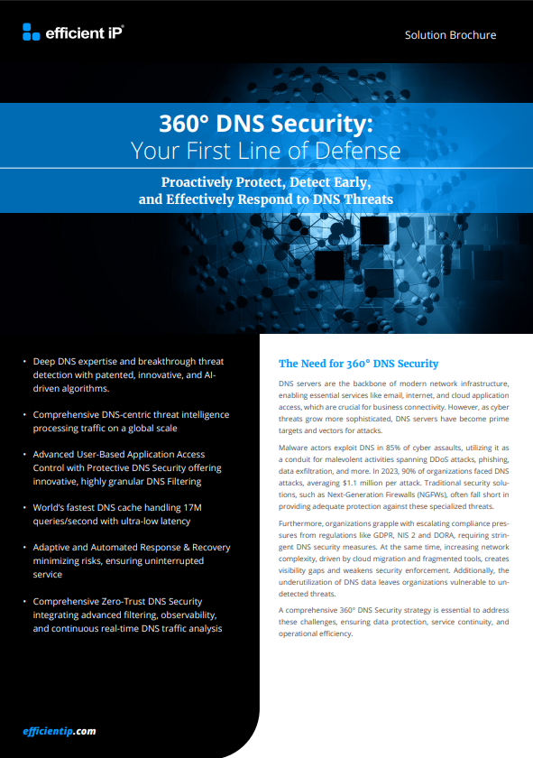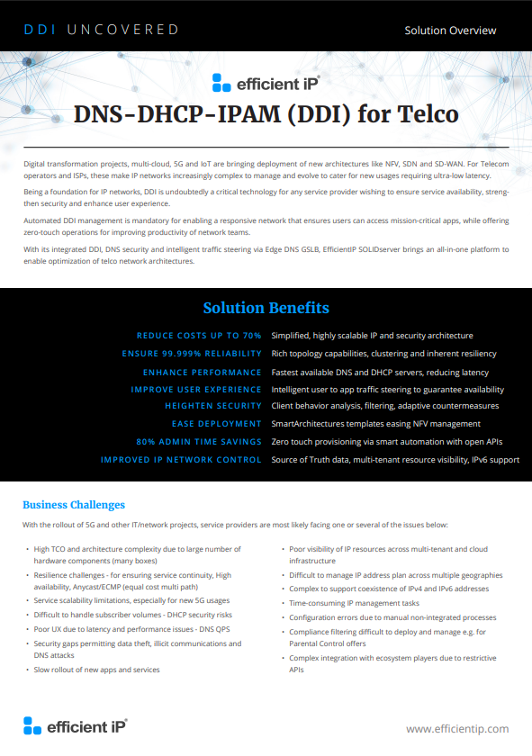 Brochures 5 Reasons Why EfficientIP DDI is Better EfficientIP 360° DNS Security EfficientIP Hybrid Multicloud DNS-DHCP-IPAM (DDI) for Telco